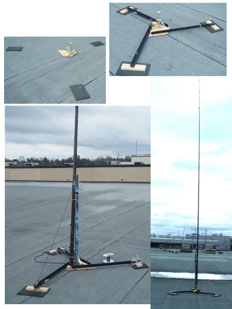 Craig’s antenna was designed for either a hard surface, like a parking lot, or a soft surface, like a lawn. The “feet” were small enough that they could have dented the roof, especially with extra weight added to the base to keep it upright in the stiff winds we were expecting. The solution we ended up with was to put some crushed cardboard under the feet and the center mast.